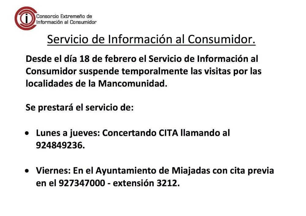 Servicio de Información al Consumidor. Desde el día 18 de febrero el Servicio de Información al Consumidor suspende temporalmente las visitas por...